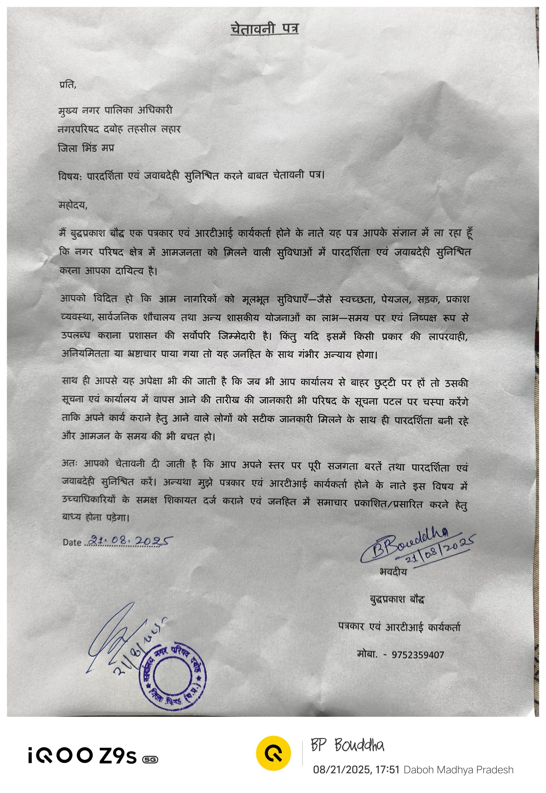 दबोह (भिंड), 21 अगस्त 2025/मूकनायक । नगर परिषद दबोह में पारदर्शिता और जवाबदेही सुनिश्चित करने को लेकर बड़ा मामला सामने आया है। आरटीआई कार्यकर्ता एवं पत्रकार बुद्धप्रकाश बौद्ध ने नगर परिषद के नवागत मुख्य नगरपालिका अधिकारी (सीएमओ) अतुल रावत को गुरुवार को एक लिखित चेतावनी पत्र जारी किया है। पत्रकार बौद्ध ने पत्र में स्पष्ट लिखा है कि नगर परिषद क्षेत्र में आमजनता को मिलने वाली सुविधाओं — जैसे स्वच्छता, पेयजल, सड़क, प्रकाश व्यवस्था, सार्वजनिक शौचालय एवं अन्य शासकीय योजनाओं के लाभ — समय पर एवं नियमानुसार उपलब्ध कराना प्रशासन की जिम्मेदारी है। लेकिन यदि इसमें लापरवाही, अनियमितता या भ्रष्टाचार पाया जाता है तो इसे जनता के साथ गंभीर अन्याय माना जाएगा। पत्र में यह भी उल्लेख है कि अधिकारी /कर्मचारी यदि कार्यालय से अनुपस्थित हों तो उसकी सूचना समय रहते सार्वजनिक की जाए, ताकि नागरिकों का समय बचे और उन्हें सटीक जानकारी मिलती रहे।