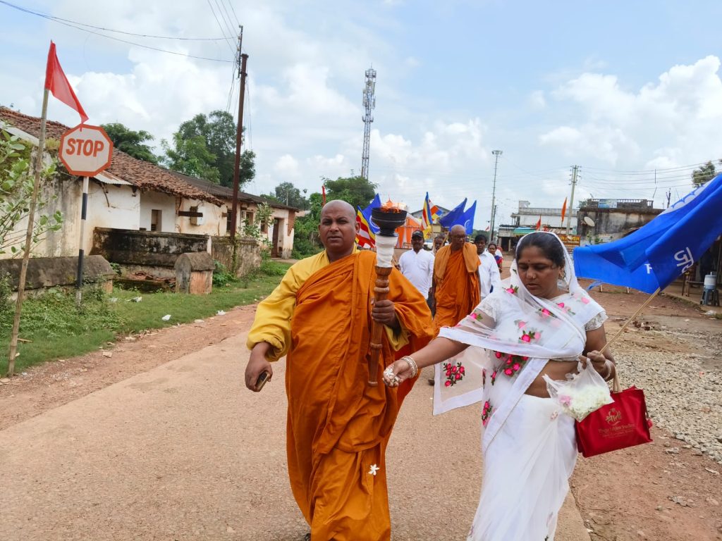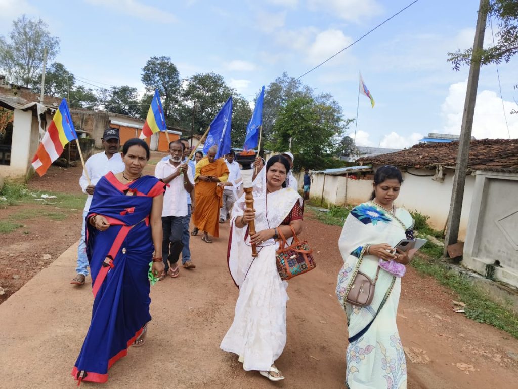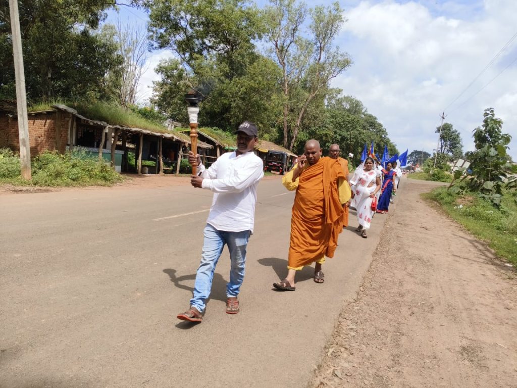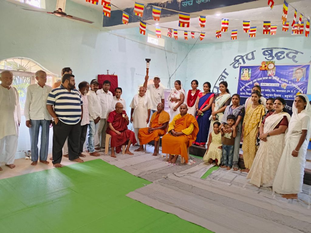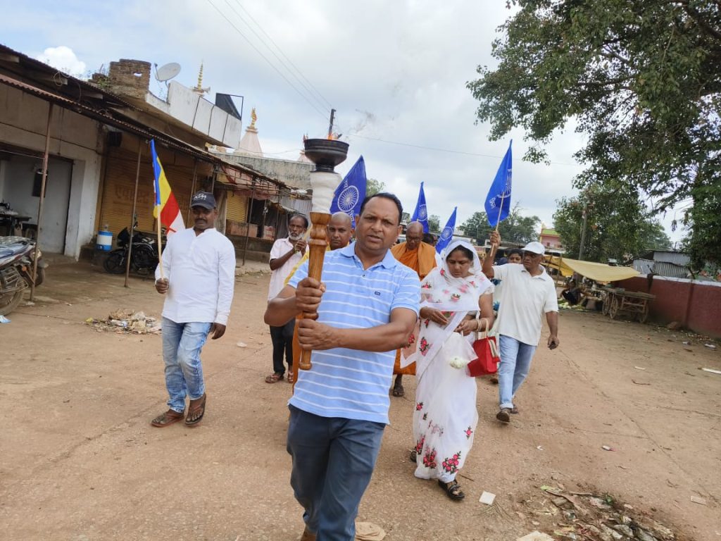 दमोह (बालाघाट) आज दिनांक 6सितम्बर 2025को पूज्य भंदन्त धम्मशिखर जी के नेतृत्व में बिहार स्थित महाबोधि महाविहार बोधगया को गैर बुद्धिस्ट से मुक्ति दिलाने को लेकर गत 20 अगस्त 2025 से डॉ. बाबा साहब अम्बेडकर की जन्मस्थली महू से शुरू हुई विशाल धम्म शांति मशाल यात्रा का आगमन आज तहसील बिरसा के अन्तर्गत ग्राम दमोह स्थित प्रज्ञादीप बुध्द विहार दमोह में आगमन हुआ ।जहां बुद्धिष्ट ग्रामवासियों द्वारा गर्मजोशी से स्वागत कर ग्राम में शांति मशाल रैली निकाली गई, जो लालचौक, बस स्टैंड , हास्पिटल होते हुए प्रज्ञादीप बुध्द विहार में बाबा साहब प्रतिमा में माल्यार्पण कर विहार में पूजा वंदना कर बोधगया महाबोधि महाविहार को मुक्त कराने का संकल्प लेकर भिक्षु संघ द्वारा किये जा रहे आंदोलन को तन मन धन से सहयोग कर सफल बनाने का आव्हान किया गया। इस अवसर पर भिक्खु संघ के सभी पूज्य भंते जी ने अपने विचारों द्वारा सभी के कल्याण की मंगलमैत्री करते हुए बुद्ध की शांति और करुणा से महाविहार के मुक्ति के लिए क्षेत्रीय धर्मालंबियों को प्रोत्साहित किया।
