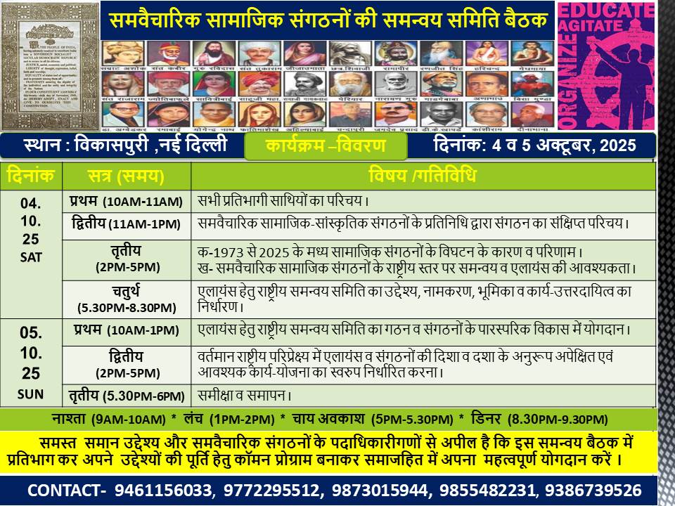राष्ट्रीय संयुक्त मोर्चा भारत के घटक संगठन मूलनिवासी मुक्ति मोर्चा के केंद्रीय कार्यालय सचिव क्रांति कुमार साव ने जानकारी देते हुए बताया कि दिनांक 4 और 5/10/2025 को प्रज्ञा बौद्ध विहार ( डॉ आंबेडकर ऑडिटोरियम) एच2 ब्लॉक लाल मार्केट विकाश पूरी दिल्ली समीप जनकपुरी वेस्ट मेट्रो स्टेशन नई दिल्ली के विकासपुरी में भारत के संविधानवादी बहुजन मूलनिवासी सम वैचारिक सामाजिक संगठनों की एक महत्वपूर्ण बैठक आयोजित की गई है।इस बैठक में भारत देश के कई सामाजिक संगठनों के प्रमुख एवं प्रतिनिधि उपस्थित होंगे इस बैठक को ऐतिहासिक बनाने के उद्देश्य से राष्ट्रीय संयुक्त मोर्चा भारत के राष्ट्रीय संयोजक संयोजक एवं अन्य मूलनिवासी मुक्ति मोर्चा के राष्ट्रीय अध्यक्ष गोपाल ऋषिकर भारती भी दिल्ली के लिए रवाना हो चुके हैं।उनके साथ संयुक्त मोर्चा भारत दिल्ली के प्रदेश अध्यक्ष और अनेकों संगठनों के पदाधिकारी उपस्थित रहेंगे।