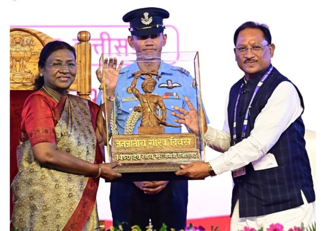 जनजातीय गौरव दिवस के अवसर पर अंबिकापुर में आयोजित कार्यक्रम में एक प्रेरक एवं गरिमामय क्षण देखने को मिला, जब मुख्यमंत्री विष्णुदेव साय ने राष्ट्रपति द्रौपदी मुर्मु को बस्तर आर्ट में निर्मित धरती आबा भगवान बिरसा मुंडा की प्रतिमा स्मृति-चिह्न के रूप में भेंट की। यह प्रतिमा जनजातीय विरासत, शौर्य और छत्तीसगढ़ की सांस्कृतिक अस्मिता का प्रतीक मानी जाती है।