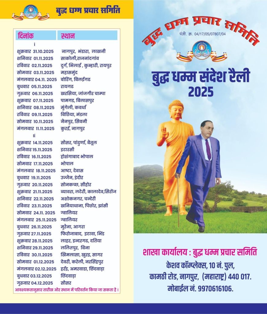 बिलासपुर। बुद्ध धम्म प्रचार समिति, काजलवाणी (छिंदवाड़ा) द्वारा आयोजित “बुद्ध धम्म संदेश रैली” का शुभारंभ 31 अक्टूबर 2025 को दीक्षाभूमि, नागपुर से किया गया। यह रैली 5 नवंबर 2025 को रायगढ़ पहुंचेगी और 6 नवंबर 2025 को जांजगीर-चांपा में आगमन करेगी।