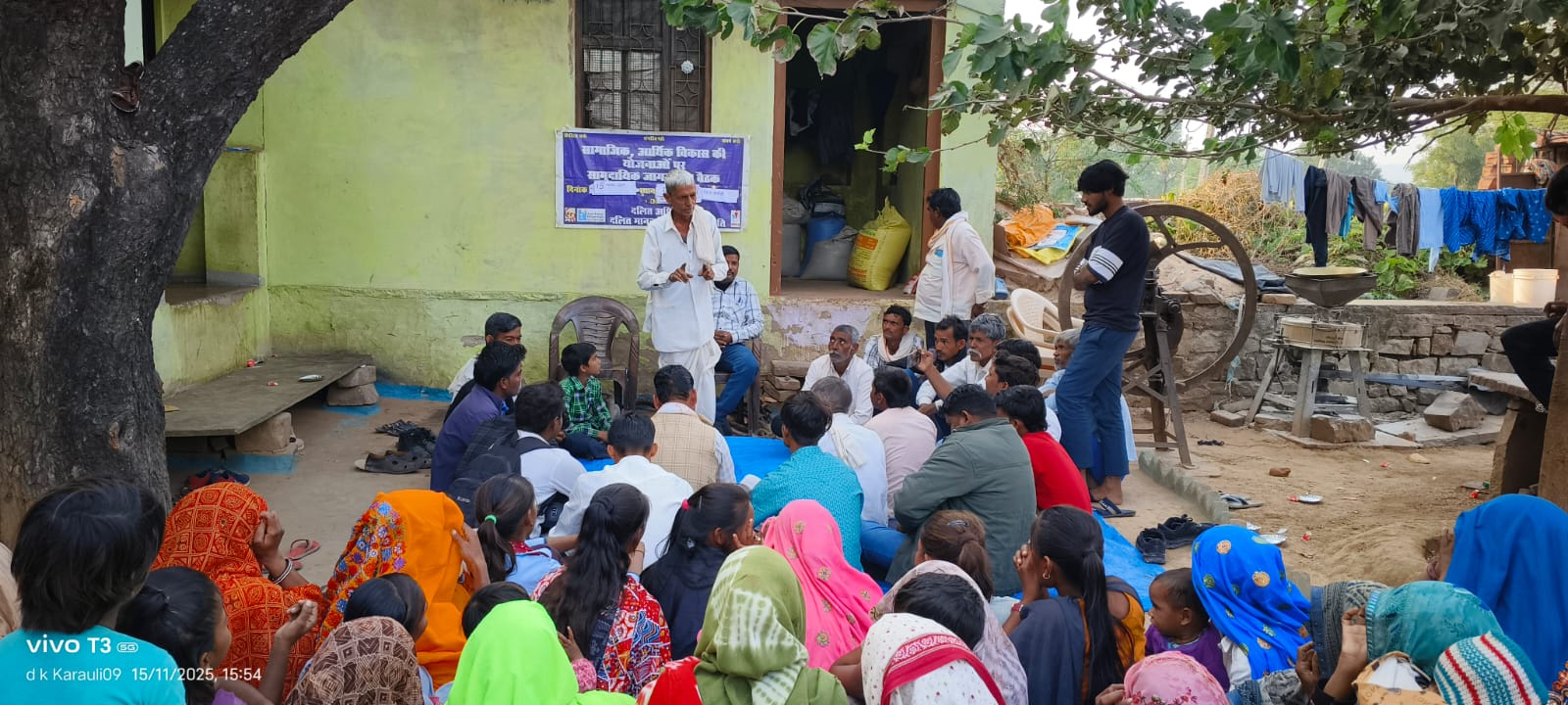 करौली के मासलपुर ब्लॉक में दलित अधिकार केंद्र के तत्वाधान में दिनांक 15 नवंबर 2025 को गांव गुर्जर भावली मे जागरूकता बैठक का आयोजन किया गया। बैठक में केन्द्र के जिला समन्वयक मीठालाल जाटव ने केंद्र का परिचय देते हुए बताया कि दलित अधिकार केंद्र राजस्थान में पिछले 20 25 वर्ष से दलित गरीब वंचित समाज अत्याचार से पिडिट लोगों को कानूनी रूप से न्याय दिलाने के के लिए काम कर रहा है , साथ ही सरकार द्वारा संचालित सामाजिक, आर्थिक उत्थान के विकास की योजनाओं जिनमे श्रम विभाग की कौशल विकास योजना, हिताधिकारी की मृत्यु पर सहायता राशि, निर्माण श्रमिक जीवन भविष्य सुरक्षा, शुभ शक्ति, शिक्षा व कौशल विकास, सिलिकोसिस पीड़ितों हेतु सहायता योजना, स्टैंड अप इंडिया योजना, प्रधानमंत्री आवास योजना, सामाजिक न्याय एवं अधिकारिता विभाग की विभिन्न पेंशन योजना, उत्तर मैट्रिक छात्रवृत्ति योजना, छात्रावास योजना, अनुप्रति योजना, एकल नारी पैंशन योजना, विधवा पुनर्विवाह उपहार, सहयोग एवं उपहार योजना, अंबेडकर पुरस्कार योजना, पालनहार, योजना, अनुजा निगम की स्वरोजगार हेतु ऋण योजना, गरिमा बालिका संरक्षण एवं सम्मान योजना, राज्यश्री योजना, नरेगा एक्ट, गार्गी पुरस्कार व मुख्यमंत्री उच्च शिक्षा छात्रवृत्ति इत्यादि की जानकारी प्रदान की। तथा योजनओं के फॉर्म समय पर ऑनलाइन आवेदन करने के बारे में भी बताया गया। आगे जानकारी देते कहा कि दलित एवं महिलाओं पर हो रहे अत्याचारों के विरुद्ध सख्त कानून होने के बावजूद भी दलित एवं महिलाओं पर आए दिन अत्याचारों में बढ़ोतरी हो रही है, हमें अत्याचारों व शोषण के विरुद्ध शिक्षित व जागरूक होकर कानूनी रूप से लड़ने की आवश्यकता है। बताया कि राजस्थान राज्य में केन्द्र के काफी प्रयासों के बाद एससी/एसटी डेवलपमेंट फंड एक्ट 2022 कानून बना है जिसमें हमें जागरुक होकर एससी/एसटी के लोगों की जनसंख्या के अनुपात में फंड का सदुपयोग करवाना होगा। हरिचरण जाटव सामाजिक कार्यकर्ता गुर्जर भावली वाले ने बताया समाज में महिलाओं की स्थिति चिंताजनक है। महिलाएं लिंग, जाति, सत्ता व गरीबी की मार झेलती है जिसके कारण वो सामाजिक, आर्थिक व राजनीतिक विकास से पीछे हट जाती हैं और रामकेश जाटव कहा की बाबा साहब ने हमे शिक्षा का अधिकार दिया है इसलिए शिक्षा पर जोर देना चाहिए समाज में महिलाओं का शिक्षा व जागरूकता के अभाव में शोषण, हिंसा व अत्याचारों का शिकार होना पड़ता है। बाबा साहब ने जो हमें शिक्षा का अधिकार दिया है उसे प्राप्त करना चाहिए तभी हमारा समाज बढ़ेगा और उन्नति करेगा एकजुटत्ता नहीं है एक दूसरे की सहायता नहीं करते हैं तथा बच्चों की पढ़ाई लिखाई मैं ध्यान कम देते हैं समाज को बाबा साहब के विचारों पर चलना चाहिए शिक्षा प्राप्त कर