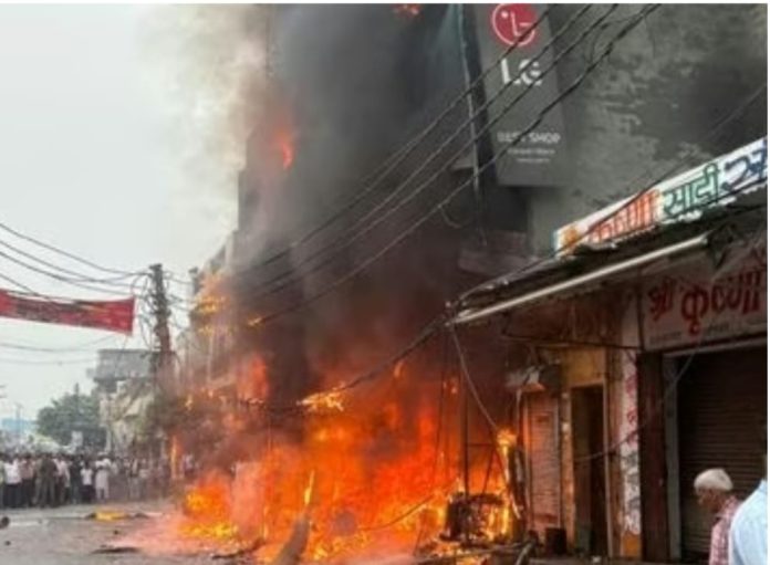 गाजियाबाद के मुरादनगर में एक इलेक्ट्रॉनिक्स शोरूम में शनिवार शाम भीसन आग लग गई। बताया जा रहा है कि शॉर्ट सर्किट के कारण शोरूम में आग लगी। मौके पर पहुंची दमकल टीम ने दो घंटे की मशक्कत के बाद आग पर काबू पाया। मेन कस्बा रोड पर विजय मंडी के सामने जितेंद्र कुमार अपने परिवार के साथ रहते हैं। उनके घर के नीचे वत्स इलेक्ट्रॉनिक्स नाम से शोरूम है। शनिवार शाम करीब पांच बजे अचानक शोरूम में आग लग गई। कुछ ही देर में आग ने पूरे शोरूम को अपनी चपेट में ले लिया। शोरूम में काम कर रहे कर्मचारी बाहर निकाल कर अपनी जान बचाने में सफल रहे। आग की चपेट में शोरूम के बाहर खड़ी गाड़ियां भी पूरी तरह जल गई। आसपास के दुकानों में अफरा-तफरी मच गई। सूचना मिलते ही दमकल विभाग की दो गाड़ियां मौके पर पहुंची और कड़ी मशक्कत के बाद आग को बुझाया गया। मेन कस्बा रोड एक भीड़ भाड़ वाला क्षेत्र है। आग लगने के दौरान सड़क पर लंबा जाम लग गया, जिससे दमकल कर्मियों को घटनास्थल तक पहुंचने में कठिनाई हुई। शोरूम मालिक जितेंद्र कुमार का परिवार उसे समय घर में ही मौजूद था। जिन्हें स्थानीय लोगों की मदद से सुरक्षित बाहर निकाल लिया गया। आग में हुए नुकसान का सटीक आकलन अभी नहीं हो सका है, लेकिन अनुमान है कि एक करोड़ रुपए से अधिक का सामान जल गया है।