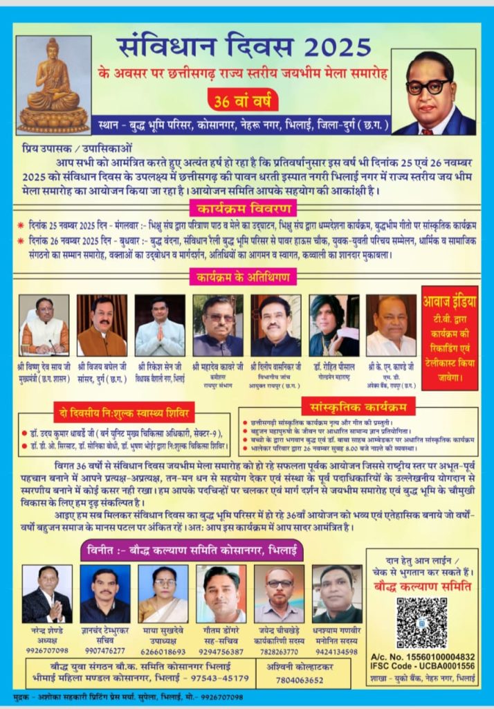 भिलाई (छत्तीसगढ़)। संविधान दिवस 2025 के पावन अवसर पर छत्तीसगढ़ की इस्पात नगरी भिलाई स्थित बुद्ध भूमि परिसर, कोसानगर, नेहरू नगर में राज्य स्तरीय 36वां जयभीम मेला समारोह भव्य रूप से 25 और 26 नवम्बर को आयोजित किया जा रहा है।