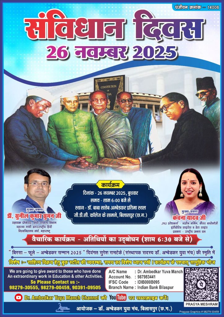 बिलासपुर। संविधान निर्माता डॉ. भीमराव अंबेडकर की महान विरासत और संविधान की मूल भावना को जन-जन तक पहुँचाने के उद्देश्य से डॉ. अंबेडकर युवा मंच, बिलासपुर द्वारा 26 नवंबर संविधान दिवस पर भव्य राष्ट्रीय आयोजन किया जा रहा है। वर्ष 2011 से लगातार हर वर्ष आयोजित हो रहा यह कार्यक्रम अब एक जन-आंदोलन का स्वरूप ले चुका है।