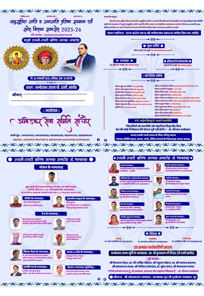 साँचौर – अम्बेडकर सेवा समिति साँचौर के तत्वावधान में आयोजित होने वाले चतुर्थ अनुसूचित जाति व जनजाति प्रतिभा सम्मान एवं स्नेहमिलन समारोह 2025-26 के आमंत्रण-पत्र का विमोचन धार्मिक व सामाजिक वातावरण के बीच श्री श्री 1008 महंत श्री गणेशनाथ महाराज, गणेश शिव मठ शिवनाथपुरा साँचौर के कर कमलों से किया गया। इस अवसर पर सामाजिक समानता, शिक्षा एवं प्रतिभा प्रोत्साहन का संदेश प्रमुखता से उभरकर सामने आया।