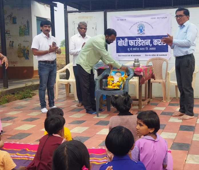 कराड : दिनांक 6 डिसेंबर 2025 भारतरत्न ,शिक्षणाचा महामेरू, घटनेचे शिल्पकार डॉ. बाबासाहेब आंबेडकर यांच्या महापरिनिर्वाण दिनाचे औचित्य साधून कार्वे थोरात मळा येथील जिल्हा परिषद प्राथमिक शाळा या ठिकाण महापरीनिर्वाण दिनानिमित्त डॉ. बाबासाहेब आंबेडकर यांच्या पवित्र स्मृतीचे स्मरण करून त्यांचे प्राथमिक शिक्षण सातारा जिल्ह्यात झाले असल्याने प्राथमिक शाळेमध्येच त्यांच्या महापरिनिर्वाण दिनानिमित्त बोधी फाउंडेशन या संस्थेने “एक वही एक पेन” हा उपक्रम गेली चार वर्षापासून वेगवेगळ्या जिल्हा परिषदेच्या शाळेमध्येच साजरा करून डॉ. बाबासाहेब आंबेडकरांना अभिवादन करण्यात आले. यावेळी महाराष्ट्रातील साधुसंत समाज सुधारक यांचे चरित्र पुस्तिका लहान मुलांना बाल संस्कारासाठी प्रदान करण्यात आले या प्रसंगी विद्यार्थ्यांनी संविधान प्रस्ताविकेचे मूळ इंग्रजी भाषेमध्ये मध्ये जशी आहे तशी प्रकट केली ही बाब जिल्हा परिषद शाळेमध्ये विशेष ठरली या कार्यक्रमाची सांगता खाऊ वाटप करून करण्यात आले यावेळी बोधी फाउंडेशनचे अध्यक्ष ॲड.विकास मस्के प्राध्यापक दीपक म्होप्रेकर ॲड. किशोर जाधव ,सचिन झिमरे जिल्हा परिषद शाळेतील शिक्षक रश्मी कांबळे मॅडम यांनी डॉक्टर बाबासाहेब आंबेडकर यांच्या जीवनावर आपले विचार मांडले तसेच माळी मॅडम व मदतनीस यांचे मोलाचे सहकार्य लाभले