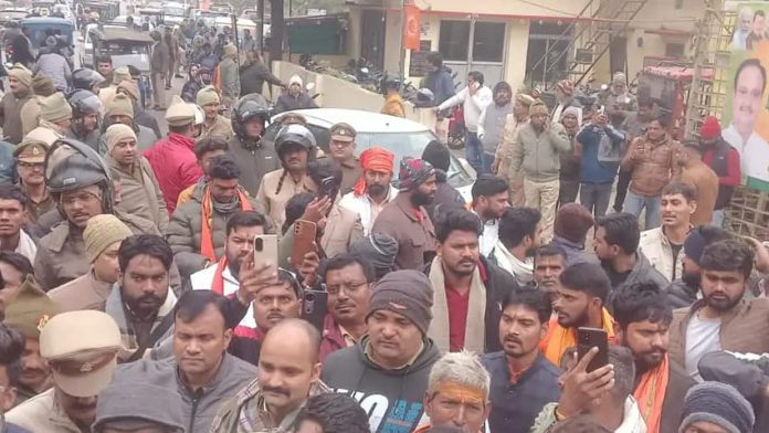 इस पूरे घटनाक्रम के बाद स्थिति और अधिक तनावपूर्ण हो गई। विश्व हिंदू महासंघ के जिला अध्यक्ष अखिलेश सिंह साथियों के साथ दक्षिण दरवाजा पुलिस चौकी पहुंचे, जहां उन्होंने नारेबाजी की, नारेबाजी के दौरान माहौल गरम रहा, हालांकि पुलिस ने मौके पर स्थिति को नियंत्रित कर लिया।