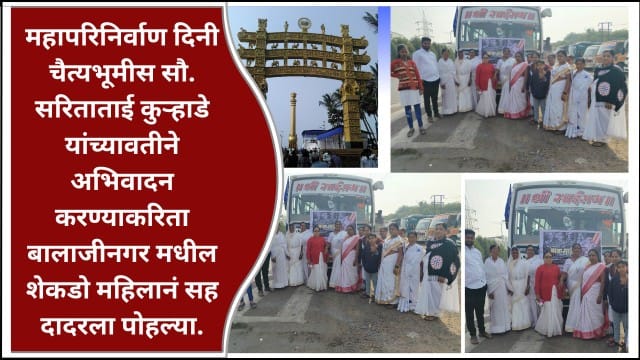 या दिवशी आपल्या मुक्तीदात्याला अभिवादन करण्यासाठी देश-विदेशातून लाखोंच्या संख्येने जनता चैत्यभूमि येथे अभिवादन करण्याकरिता येते. या मूक्तीदात्यास अभिवादन करण्यास व बाबासाहेबाच्या विचाराची शिदोरी घेऊन जाण्यासाठी सौ. सरिताताई योगेश कुऱ्हाडे प्रभाग क्र. ८ (क) सर्वसाधारण महिला गट बालाजीनगर येथून शेकडो महिलानंसह दादरला पोहचल्या प्रवासात त्यानीं बाबासाहेबांचे विचार महिलाना सांगताना म्हणाल्या कि बाबासाहेब म्हणायचे ‘नाचून मोठे होऊ नका. तर वाचून मोठे व्हा, माझ्या नावाचा जय जयकार करण्यापेक्षा .. माझे अपूर्ण राहिलेले काम प्राणपणाने पूर्ण करा. जर तुमच्याकडे दोन नाणी असतील तर एका नाण्याची भाकर घ्या आणि एका नाण्याचे पुस्तक घ्या. भाकर तुम्हाला जगवेल तर पुस्तक जगण्याची कला शिकवेल.’ अशा विचारानंची देवाणघेवाण करत प्रवास केला.