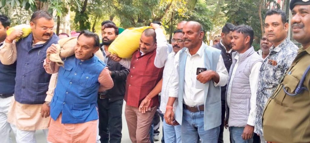 बिलासपुर।जिला कांग्रेस कमेटी के पूर्व अध्यक्ष व बेलतरा विधानसभा के कांग्रेस विधायक प्रत्याशी विजय केशरवानी किसानों के साथ कंधे पर धान की बोरी लादकर कलेक्टोरेट पहुंचे। कलेक्टर से मिलकर तय समय में किसानों का धान खरीदने की मांग रखी। विजय ने कलेक्टर को ज्ञापन सौंपते हुए खरीदी केंद्रों में किसानों का धान तय समय पर खरीदी करने की मांग की। साथ ही चेतावनी दी कि यदि किसानों का धान नहीं बिका तो सत्ताधारी दल के विधायक, मंत्री व जनप्रतिनिधियों के घर में किसान अपना धान रखेंगे। इसकी पूरी जिम्मेदारी जनप्रतिनिधियों व प्रशासन की होगी।