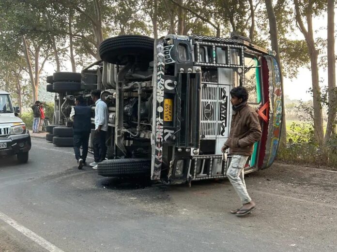 बस्ती। पचमोहिनी चौराहे के पास एक बड़ा हादसा टल गया। डुमरियागंज से बस्ती की ओर जा रहा एक ट्रक अनियंत्रित होकर पलट गया। इस घटना में किसी तरह की जनहानि नहीं हुई, हालांकि यातायात बाधित हो गया।