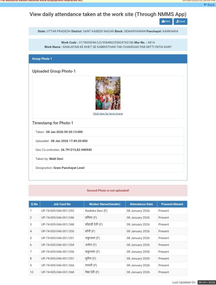 मनरेगा के तहत रामजतन के खेत से कब्रिस्तान तक चक रोड पटाई कार्य में बड़े पैमाने पर फर्जीवाड़ा उजागर हुआ है। कार्यस्थल पर प्रतिदिन 70 मजदूरों की फर्जी हाजिरी केवल एक ही फोटो के सहारे लगाई जा रही है। हैरानी की बात यह है कि जहां पुरुष की फोटो लगी है, वहां महिलाओं के नाम दर्ज हैं
