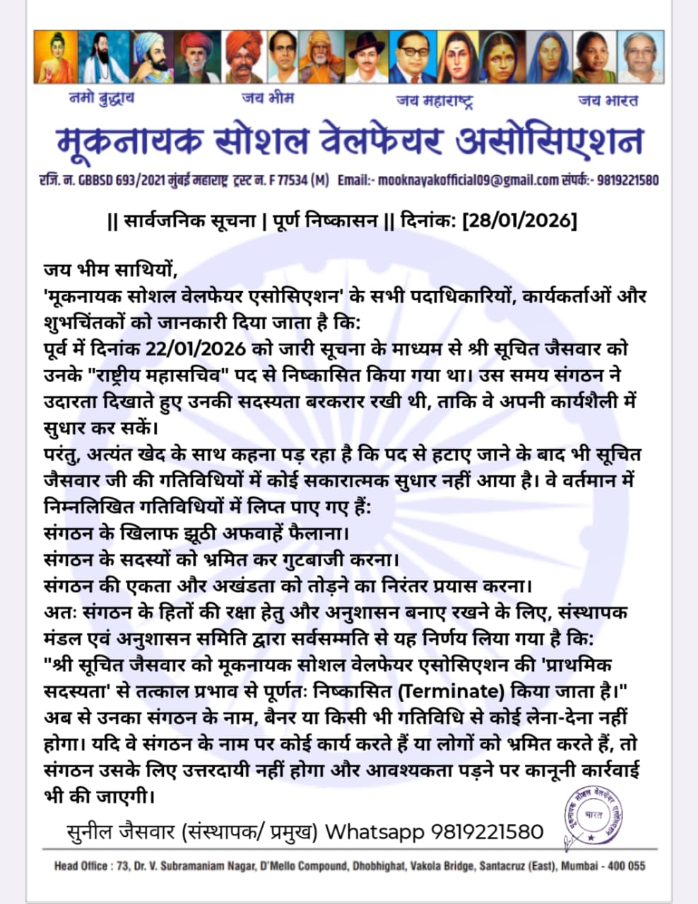 ऐसे तमाम कारणों से सूचित जैसवार को मूकनायक संगठन से तत्काल बर्खास्त किया गया है और संगठन में उनकी सदस्य भी रद्द की गई है।