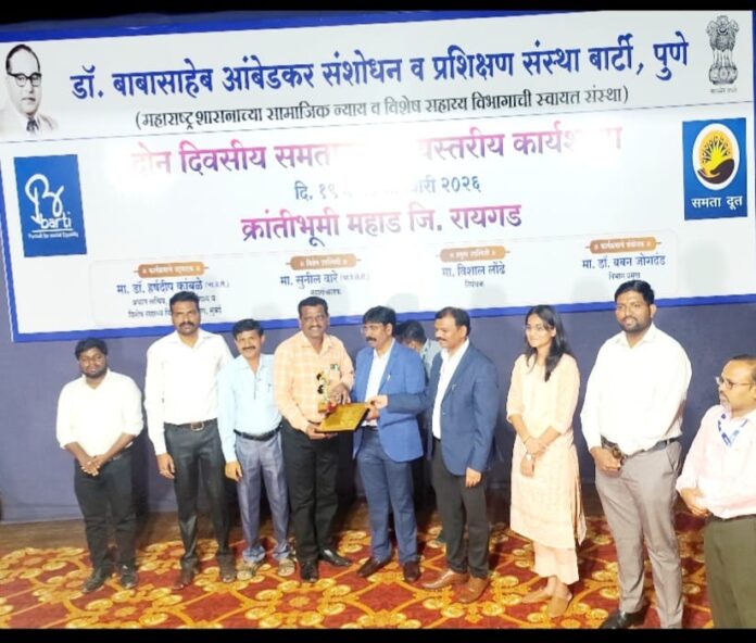 दिनांक १९ व २० जानेवारी रोजी दोन दिवसीय राज्यस्तरीय कार्यशाळा रायगड जिल्ह्यातील क्रांतिभूमी महाड येथे डॉ. बाबासाहेब आंबेडकर स्मारक येथे पार पडली. कार्यशाळेचे उद्घाटन सामाजिक न्याय विभागाचे प्रधान सचिव मा. हर्षदीप कांबळे यांनी केले. कार्यशाळेला विशेष उपस्थिती म्हणून बार्टीचे मा.सुनील वारे निबंधक मा.विशाल लोंढे,कार्यशाळेचे मुख्य संयोजक व विभाग प्रमुख डॉ.बबन जोगदंड, प्रकल्प व्यवस्थापक सुमित थोरात यांच्यासह बार्टीचे महाराष्ट्रातील प्रकल्प अधिकारी व समतादूत उपस्थित होते.