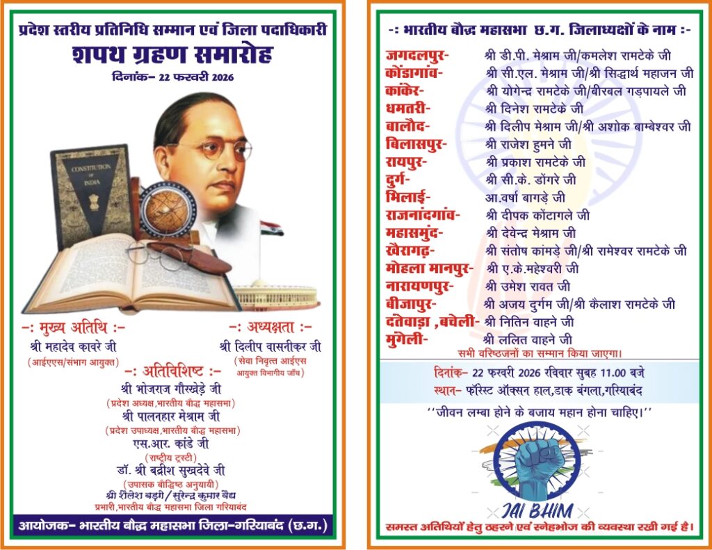 भारतीय बौद्ध महासभा छत्तीसगढ़ प्रांत के तत्वावधान में जिला गरियाबंद द्वारा प्रदेश स्तरीय प्रतिनिधि सम्मान एवं जिला पदाधिकारी शपथ ग्रहण समारोह का आयोजन दिनांक 22 फरवरी 2026, रविवार को प्रातः 11:00 बजे फॉरेस्ट ऑक्सन हॉल, डाक बंगला, गरियाबंद में किया जा रहा है।