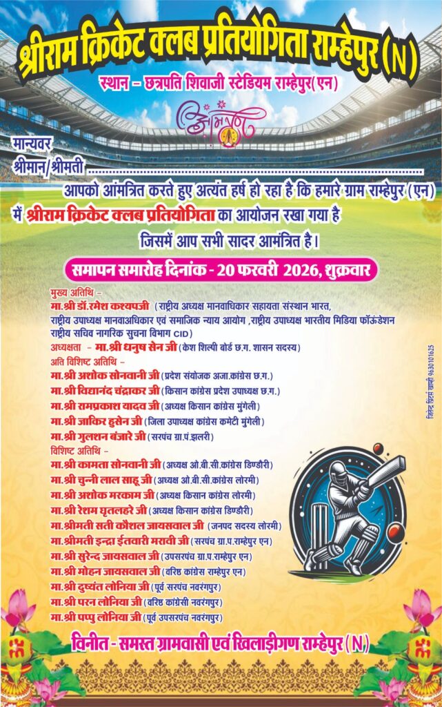 राम्हेपुर ( एन)। ग्राम राम्हेपुर (एन) में आयोजित श्रीराम क्रिकेट क्लब प्रतियोगिता का समापन समारोह 20 फरवरी 2026, शुक्रवार को छत्रपति शिवाजी स्टेडियम में भव्य एवं गरिमामय वातावरण में संपन्न होगा। इस अवसर पर मानवाधिकार सहायता संस्थान के राष्ट्रीय अध्यक्ष डॉ. रमेश कश्यप मुख्य अतिथि के रूप में उपस्थित रहेंगे, जिससे आयोजन की प्रतिष्ठा और महत्व को नई ऊंचाई मिलेगी।