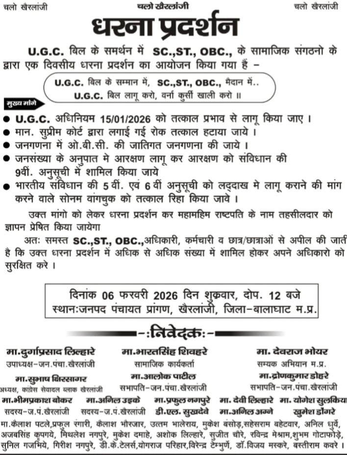 खैरलांजी (बालाघाट)। यूजीसी बिल को तत्काल लागू किए जाने सहित अन्य प्रमुख मांगों को लेकर आगामी 6 फरवरी 2026, शुक्रवार को जनपद पंचायत प्रांगण, खैरलांजी में एससी, एसटी एवं ओबीसी सामाजिक संगठनों के संयुक्त तत्वावधान में एक भव्य एक दिवसीय धरना-प्रदर्शन आयोजित किया जाएगा। कार्यक्रम दोपहर 12 बजे से प्रारंभ होगा।