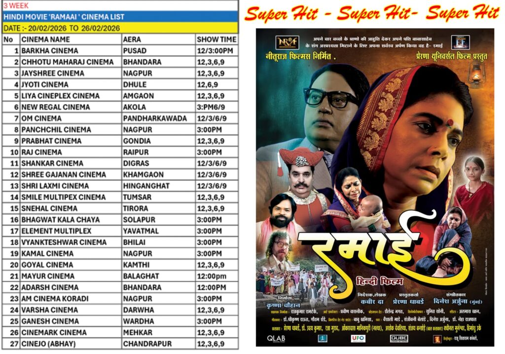नीतू राज फिल्म्स द्वारा निर्मित छत्तीसगढ़ की पहली हिंदी फीचर फिल्म “रमाई” शानदार प्रदर्शन करते हुए अपने तीसरे सप्ताह में प्रवेश कर चुकी है। फिल्म 20 फरवरी 2026 से 26 फरवरी 2026 तक एक सप्ताह के लिए दर्शकों के सहयोग से 27 सिनेमाघरों में प्रदर्शित की जा रही है।