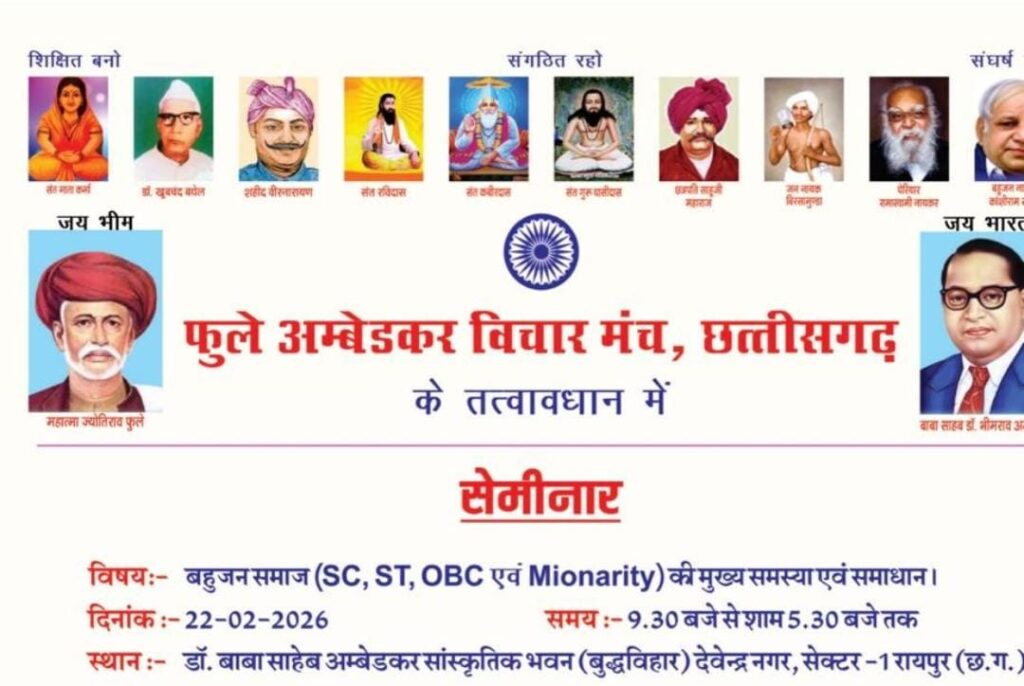 फुले अम्बेडकर विचार मंच, छत्तीसगढ़ के तत्वावधान में “बहुजन समाज (SC, ST, OBC एवं अल्पसंख्यक) की मुख्य समस्या एवं समाधान” विषय पर एक दिवसीय सेमीनार का आयोजन 22 फरवरी 2026 को किया जा रहा है।