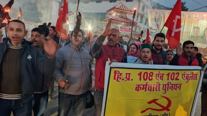 ठाकुर दास भारती | एम्बुलेंस कर्मचारी यूनियन की हड़ताल के तीसरे दिन आज मंडी के चौहट्टा बाज़ार में सरकार का पुतला जलाया गया उससे पहले शहर में शव यात्रा निकाली गई।जिसका नेतृत्व सीटू ज़िला प्रधान भपेंद्र सिंह महासचिव राजेश शर्मा यूनियन के प्रधान सुमित कुमार महासचिव पंकज कुमार व अन्य पदाधिकारियों ने किया। सीटू ज़िला प्रधान भूपेंद्र सिंह और यूनियन के प्रधान सुमित कुमार ने इस अवसर पर सरकार और मेड्सवान कम्पनी द्धारा कर्मचारियों को न्यूनतम वेतन न देने का आरोप लगाया। मीडिया में आंदोलन की अगली रणनीति की जानकारी देते हुए कहा कि रविवार को महात्मा गांधी की प्रतिमा गांधी चौक पर मुंह, आंख, कान पर काली पटीयाँ बांधकर प्रदर्शन किया जायेगा और सोमवार को शिमला में राष्ट्रीय स्वास्थ्य मिशन के प्रबधक निदेशक कार्यालय का घेराव किया जायेगा। सुमित कुमार ने बताया कि 6 फ़रवरी को यूनियन ने स्वस्थ्य मंत्री धनीराम शांडिल और स्वास्थ्य सचिव एमसुधा को शिमला में ज्ञापन सौंपा है | लेकिन अभी तक उस पर कोई सुनवाई नहीं हुई है।यूनियन नेताओं ने बताया कि वर्ष 2022 में पूर्व भाजपा सरकार ने पांच साल का समझौता मेड्सवान कंपनी से किया है | उसमें मज़दूरों को दिए जा रहे मासिक वेतन में ओवर टाईम और व हाऊस रेंट भी शामिल कर दिया है | और कम्पनी को अदा किया जाने वाला पीएफ़ भी मज़दूरों के वेतन में से ही काटा जाता है।कर्मचारियों को न्यून्तम वेतन 5700/रु ही दिया जा रहा है जो सरकार की दरों के अनुसार 13750/रु मिलना चाहिए और दो गुणाओवरटाइम अलग से देय होता है जिसे कंपनी नहीं दे रही है।जिसके कारण मज़दूरों को पांच दिन की हड़ताल करनी पड़ रही है और यदि जल्दी समाधान नहीं किया गया है जिसके चलते कर्मचारियों को पांच दिन की हड़ताल करनी पड़ी है और अब भी सुनवाई नहीं हुई तो आंदोलन और उग्र और तेज़ किया जायेगा।