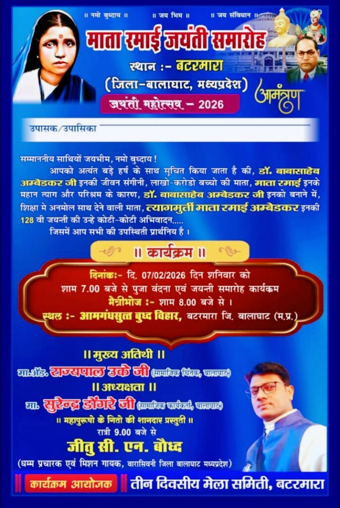 वारासिवनी -/बटरमारा ।डॉ. बाबासाहेब आंबेडकर की धर्मपत्नी, त्याग, संघर्ष और मातृत्व की प्रतिमूर्ति माता रमाई आंबेडकर की 128वीं जयंती के पावन अवसर पर माता रमाई जयंती समारोह 2026 का आयोजन ग्राम बटमारा, जिला बालाघाट (मध्यप्रदेश) में भव्य रूप से किया जा रहा है। इस आयोजन को लेकर क्षेत्र में सामाजिक, शैक्षणिक एवं बौद्ध अनुयायियों में विशेष उत्साह देखा जा रहा है।