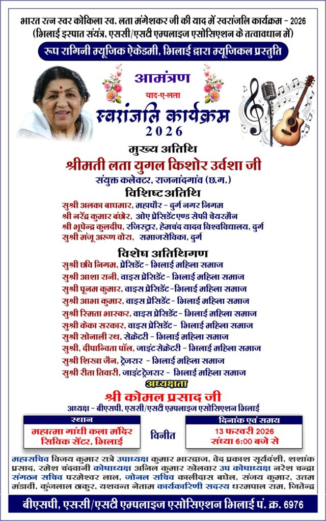 भिलाई इस्पात संयंत्र एस.सी./एस.टी. एम्पलाईज एसोसिएशन (पंजीयन क्र. 6976) एवं रूप रागिनी म्यूजिक एकेडेमी के संयुक्त तत्वावधान में 13 फरवरी 2026 को संध्या 6:00 बजे महात्मा गांधी कला मंदिर, सिविक सेंटर, भिलाई में भारत रत्न, स्वर कोकिला स्व. सुश्री लता मंगेशकर की स्मृति में “याद-ए-लता स्वरांजली” कार्यक्रम का आयोजन किया जाएगा।