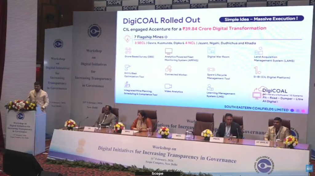 सार्वजनिक उपक्रमों में डिजिटल पारदर्शिता और जवाबदेही के क्षेत्र में साउथ ईस्टर्न कोलफील्ड्स लिमिटेड (SECL) ने एक महत्वपूर्ण उपलब्धि हासिल की है। केन्द्रीय सतर्कता आयोग (CVC) द्वारा नई दिल्ली के स्कोप कन्वेंशन सेंटर में आयोजित राष्ट्रीय कार्यशाला “डिजिटल इनिशिएटिव्स फॉर इंक्रीजिंग ट्रांसपेरेंसी इन गवर्नेंस” में SECL की डिजिटल ट्रांसफॉर्मेशन पहल ‘डिजीकोल (DigiCOAL)’ को सुशासन के प्रभावी मॉडल के रूप में प्रस्तुत किया गया।
