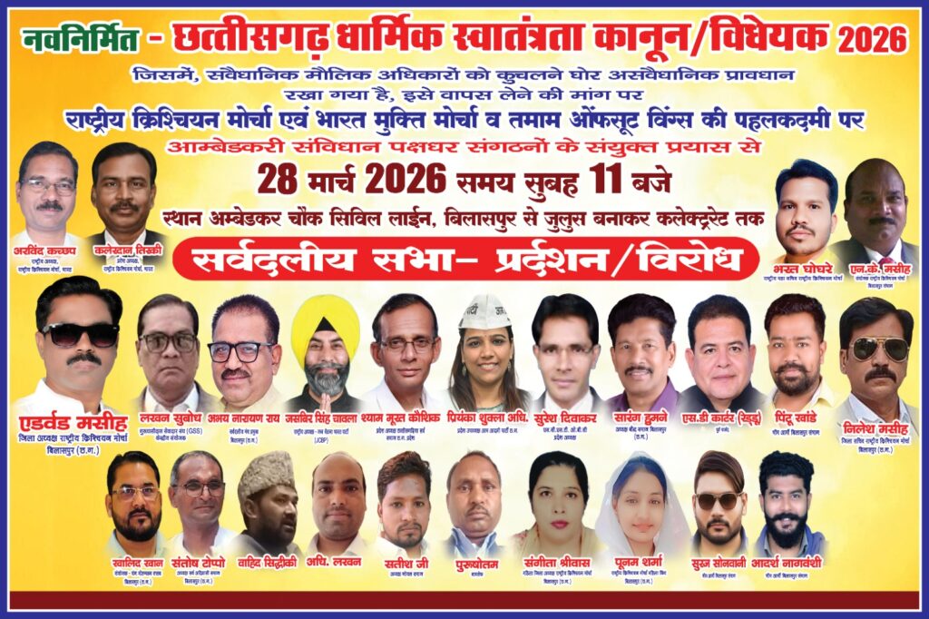 👉नवनिर्मित छत्तीसगढ़ धार्मिक स्वतंत्रता कानून/विधेयक 2026 जिसमें संवैधानिक मौलिक अधिकारों को कुचलने घोर असंवैधानिक प्रावधान रखा गया है। इसे वापस लेने की मांग पर राष्ट्रीय क्रिश्चियन मोर्चा की पहलकदमी पर आम्बेडकरी संविधान पक्षधर संगठनों के संयुक्त प्रयास से 28 मार्च 2026 को बिलासपुर में आयोजित विरोध सभा-प्रदर्शन में गुरुघासीदास सेवादार संघ (GSS) ने सहभागिता निभाने का निर्णय लिया है।