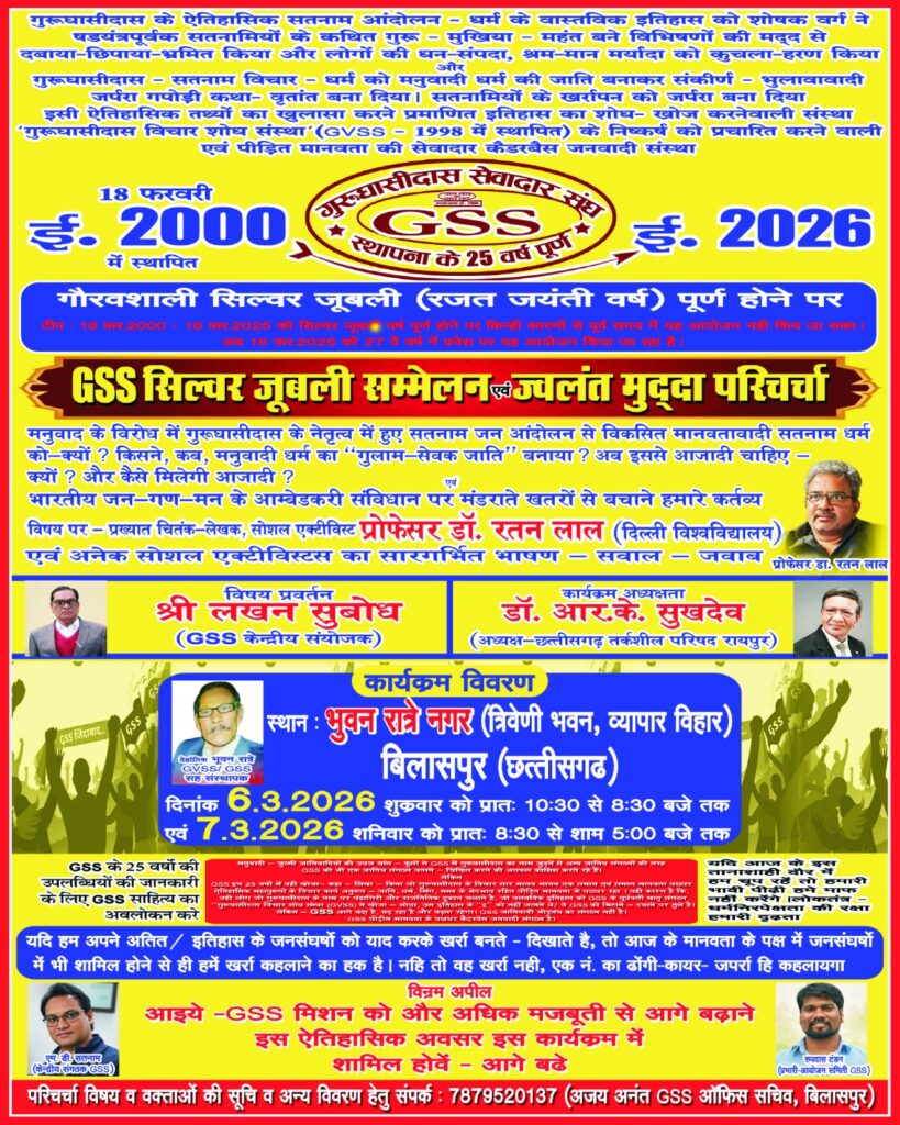गुरुघासीदास सेवादार संघ (GSS) का रजत जयंती वर्ष: 6-7 मार्च 2026 को बिलासपुर में दो दिवसीय राष्ट्रीय परिचर्चा