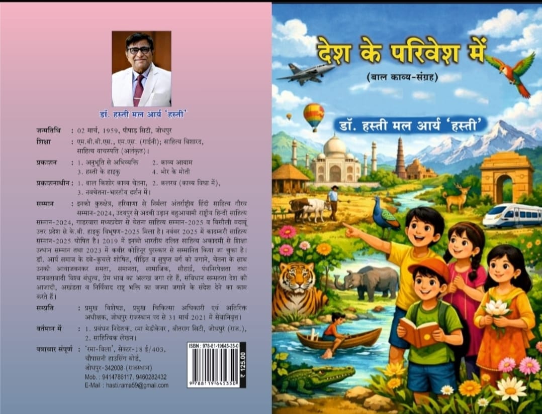 जोधपुर। डॉ सावित्री मदन डागा साहित्य भवन* नेहरू पार्क, सरदार पुरा जोधपुर में *प्रात: 11.00 बजे से डॉ हस्ती की “देश के परिवेश में” पुस्तक का विमोचन आयोजित किया जा रहा है। देश के परिवेश में बाल पुस्तक एक बार काव्य संग्रह है। डॉ हस्ती मल आर्य की इससे पूर्व पांच पुस्तकें प्रकाशित हो चुकी है।दो काव्य पुस्तकें *अनुभूति से अभिव्यक्ति*,व *काव्य आयाम* को काफी अंतर्राष्ट्रीय,व राष्ट्रीय पुरस्कार प्राप्त है। इनकी दो हाइकु विधा पर *हस्ती के हाइकु* व भोर के मोती पर इन्हें उत्तर प्रदेश के बिसौली से *हाइकु विभूषण* सम्मान से सम्मानित हो चुकी है।डॉ हस्ती मल को मानविकी बहुउद्देशीय शोध संस्थान, रावतसर हनुमान गढ़ से इनके शोध पत्र *बाजार वाद व स्त्री विमर्श* पर इन्हें *साहित्य वाचस्पति* अलंकरण पुरस्कृत हो चुका है।मध्यप्रदेश के बालाघाट से *हिंदी साहित्य रत्न 2026 की मानद् उपाधि* दी गई है। इसके अलावा डॉ आर्य को अंतररार्ष्ट्रीय मात्र भाषा दिवस पर *मातृभाषा रत्न* की मानद उपाधि से नेपाल से पंजीकृत संस्था”शब्द प्रतिभा बहुउद्देशीय सम्मान फाऊंडेशन द्वारा 21*फरवरी को ही इनके उल्लेखनीय कार्यों का मूल्यांकन कर दिया गया है। डॉ हस्ती मल पेशे से चिकित्सक एवं लेप्रोस्कोपिक सर्जन भी है। तथा निरंतर साथ में शल्य कार्य भी अंजाम दे रहे हैं ।डॉ आर्य की बाल पुस्तक बाल काल के बच्चों में संस्कार, शिक्षा के साथ वैज्ञानिक सोच के साथ विकास की कड़ी में भारतीय संस्कृति की संवाहक व ज्ञान वर्धक काव्यों का संग्रह है।आशा है समाज के लिए पथदर्शक सिद्ध होंगी यह विमोचन श्री दिनेश जी सारंग,से नि आई आर एस व वरिष्ठ साहित्यकार अंतर्राष्ट्रीय स्तर पर खगोलशास्त्र में दूरबीन के निर्माण में प्रथम स्थान प्राप्त, साहित्यकार, राजस्थान साहित्य अकादमी में ख्याति प्राप्त है वहीं विशिष्ट अतिथि श्री महेश कुमार पंवार पूर्व आर ए एस व सचिव संगीत नाटक अकादमी तथा साहित्य कार, रंगकर्मी, तथा नाटक लेखक, पत्रवाचन श्री घनश्याम नाथ कच्छावा सुजानगढ़ के साहित्य मनीषी व हिंदी व राजस्थानी के लेखक कविहै अध्यक्षता श्रीमान सत्यदेव संवितेंद्र बाल, हिंदी व राजस्थानी कविता, गीत के लेखक करेंगे। इनकी 72 से अधिक पुस्तकें प्रकाशित हैं।मंच संचालन जोधपुर राजस्थान के वरिष्ठ साहित्यकार , राजस्थान अकादमी से पुरस्कृत ग़ज़ल कार, जोधपुर की धड़कन श्री मनशाह नायक करेंगे।