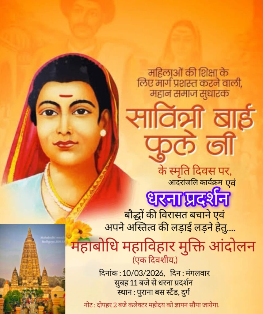 ज्ञानज्योति सावित्रीबाई फूले स्मृति दिवस के अवसर पर 10 मार्च 2026, मंगलवार को दुर्ग में महाबोधि महाविहार मुक्ति आंदोलन के समर्थन में एक दिवसीय धरना प्रदर्शन आयोजित किया जाएगा। यह कार्यक्रम सुबह 11 बजे से पुराना बस स्टैंड, दुर्ग में आयोजित होगा।