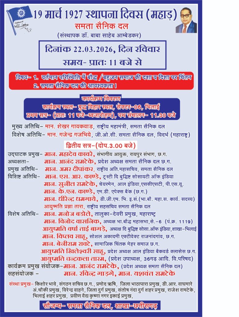 समता सैनिक दल शाखा छत्तीसगढ़ द्वारा आयोजित इस कार्यक्रम में बड़ी संख्या में बौद्ध एवं बहुजन समाज के लोगों की सहभागिता अपेक्षित है। आयोजकों ने सभी सामाजिक संगठनों, युवाओं और आम नागरिकों से कार्यक्रम में शामिल होकर समता, बंधुत्व और न्याय के संदेश को मजबूत करने की अपील की है।