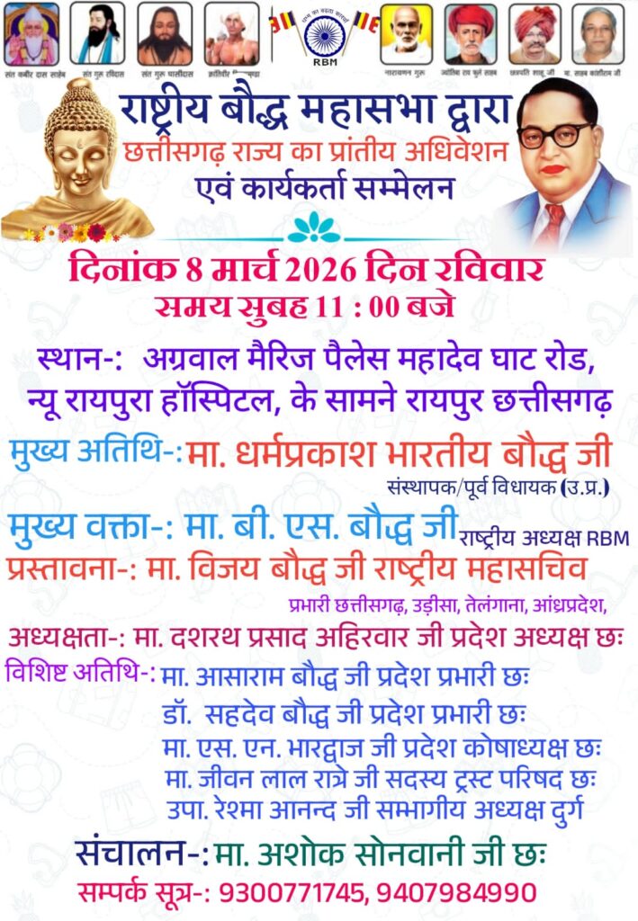 राष्ट्रीय बौद्ध महासभा द्वारा छत्तीसगढ़ राज्य का प्रांतीय अधिवेशन एवं कार्यकर्ता सम्मेलन 8 मार्च 2026, रविवार को प्रातः 11:00 बजे आयोजित किया जाएगा। कार्यक्रम का आयोजन अग्रवाल मैरिज पैलेस, महादेव घाट रोड, न्यू रायपुरा हॉस्पिटल के सामने, रायपुर (छत्तीसगढ़) में होगा।