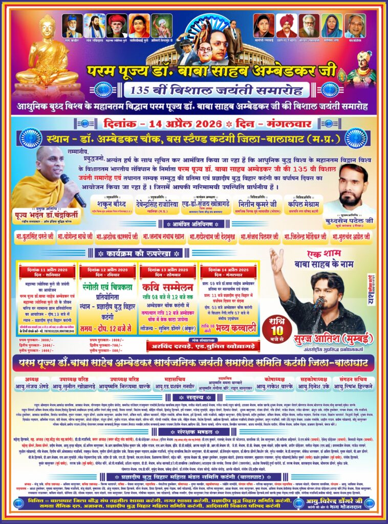 कटंगी (बालाघाट)। नगर में 11 से 14 अप्रैल 2026 तक प्रज्ञा दीप बुद्ध विहार में आयोजित होने जा रहा चार दिवसीय जयंती समारोह सामाजिक, धार्मिक और वैचारिक चेतना का भव्य संगम साबित होगा। यह आयोजन डॉ. भीमराव अंबेडकर के विचारों, समानता और शिक्षा के संदेश को जन-जन तक पहुंचाने के साथ-साथ बौद्ध धम्म के प्रचार-प्रसार का सशक्त माध्यम बनेगा।