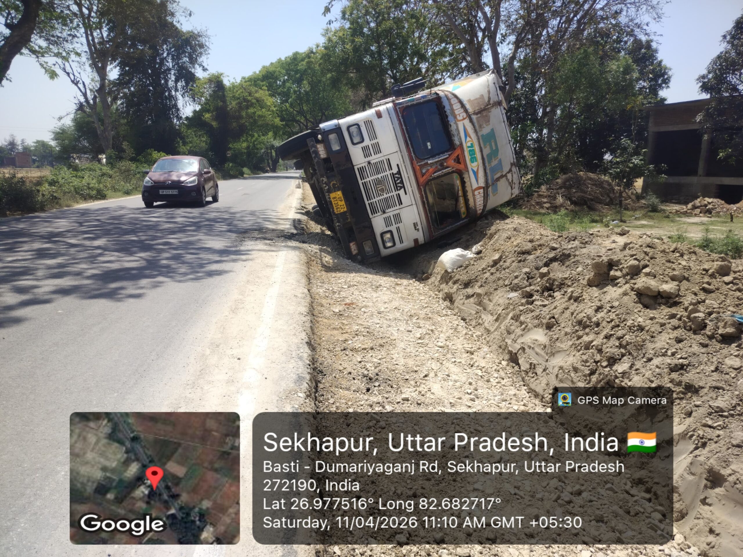बस्ती। बस्ती–डुमरियागंज मार्ग पर सड़क निर्माण कार्य के दौरान सुरक्षा मानकों की अनदेखी एक बार फिर सामने आई है। शुक्रवार देर रात लगभग 11 बजे एक चलती ट्रक सड़क पर चल रहे निर्माण कार्य के बीच असंतुलित होकर पलट गई। गनीमत रही कि इस हादसे में चालक और खलासी को केवल मामूली चोटें आईं।