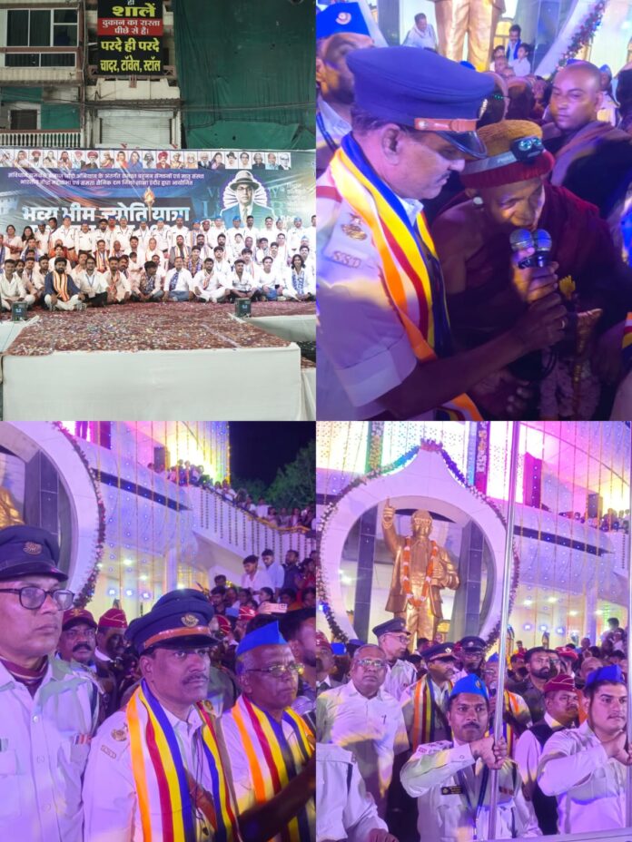 इंदोर(मध्यप्रदेश): विश्वरत्न महामानव, नव भारत निर्माता बोधिसत्व डॉ बाबासाहेब आंबेडकर यांच्या 135 व्या जयंती निमित्त डॉ बाबासाहेब आंबेडकर यांची जन्म भूमी, महू येथे दिनांक 13/4/2026 रोजी रात्री 12 वाजता दि बुद्धिस्ट सोसायटी ऑफ इंडिया व समता सैनिक दल इंदोर शाखेच्यावतीने डॉ बाबासाहेब आंबेडकर जन्मभूमी, महू येथील भव्य स्मारक मध्ये दि बुद्धिस्ट सोसायटी ऑफ इंडियाचे ट्रस्टी, राष्ट्रीय उपाध्यक्ष व समता सैनिक दलाचे स्टाफ ऑफिसर ॲड डॉ एस के भंडारे यांच्या नेतृत्वाखाली मानवंदना देण्यात आली. यावेळी राष्ट्रीय सचिव बी एच गायकवाड गुरुजी, मध्यप्रदेश उत्तर राज्य अध्यक्ष आर सी दिवाकर,मध्यप्रदेश दक्षिण राज्य सरचिटणीस व लेफ्टनंट कर्नल उत्तम प्रधान, उपाध्यक्ष शांताराम वाघ, उपाध्यक्ष संतोष गवले,इंदोर जिल्हा अध्यक्ष शुभम रायपुरे, एस एस डी जिल्हा उपाध्यक्ष विशाल इंगळे इत्यादी पदाधिकारी उपस्थित होते. तसेच समता सैनिक दलाचे लेफ्टनंट जनरल रमेश वाघमारे (ठाणे), मेजर जनरल मधुकर हिवराळे (नवी मुंबई) आणि इंदोर, दतिया, भोपाळ, नवी मुंबई, ठाणे, जळगाव, बुलढाणा इत्यादी जिल्ह्यातून मोठ्या संख्येने पुरुष व महिला सैनिक व कार्यकर्ते यांनी डॉ बाबासाहेब आंबेडकर यांना मानवंदना दिली. पूज्य भंते ज्ञान ज्योती, भीम जन्मभूमी स्मारक समितीचे अध्यक्ष भंते प्रज्ञाशील यांच्या हस्ते त्रिसरण पंचशील, भीमस्मरण सामूहिक घेण्यात आले. त्यानंतर आकाशात फटाके उडवन्यात आले.