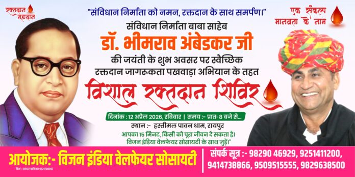रायपुर संविधान निर्माता बाबा साहेब डॉ. भीमराव अंबेडकर की जयंती के उपलक्ष्य में 12 अप्रैल 2026, रविवार को विशाल रक्तदान शिविर का आयोजन किया जाएगा। यह शिविर रक्तदान जागरूकता पखवाड़ा अभियान के अंतर्गत सुबह 8 बजे से हस्तीमल पावन धाम, रायपुर में आयोजित होगा।