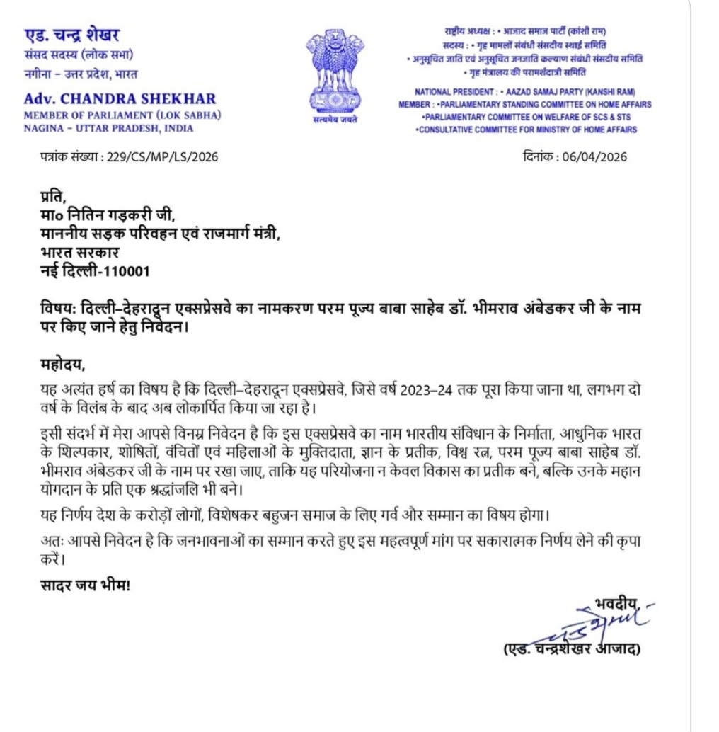 नई दिल्ली:नगीना सांसद और आजाद समाज पार्टी के प्रमुख चंद्रशेखर आजाद ने केंद्रीय सड़क परिवहन एवं राजमार्ग मंत्री नितिन गडकरी को एक पत्र लिखकर दिल्ली-देहरादून एक्सप्रेसवे का नामकरण संविधान निर्माता परम पूज्य बाबा साहेब डॉ. भीमराव अंबेडकर के नाम पर करने की मांग की है। सांसद चंद्रशेखर आजाद ने अपने पत्र में इस बात पर जोर दिया है कि बाबा साहेब डॉ. भीमराव अंबेडकर का भारत के निर्माण में अतुलनीय योगदान है। करोड़ों लोगों की आस्था और जनभावनाओं को देखते हुए, इस महत्वपूर्ण एक्सप्रेसवे का नाम उनके नाम पर रखना देश के लिए गौरव की बात होगी। उन्होंने सोशल मीडिया प्लेटफार्म ‘X’ पर इस पत्र को साझा करते हुए मंत्री गडकरी से इस मांग पर सकारात्मक निर्णय लेने का आग्रह किया है।दिल्ली-देहरादून एक्सप्रेसवे का निर्माण अंतिम चरण में है, जो दिल्ली से उत्तराखंड की राजधानी के बीच की दूरी को काफी कम कर देगा। माना जा रहा है कि इसका उद्घाटन 14 अप्रैल 2026 (अंबेडकर जयंती) के आसपास हो सकता है, जिससे इस मांग की प्रासंगिकता और बढ़ गई है।