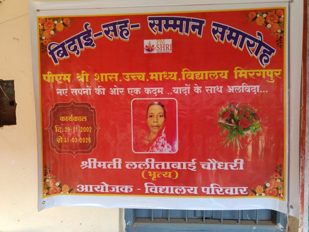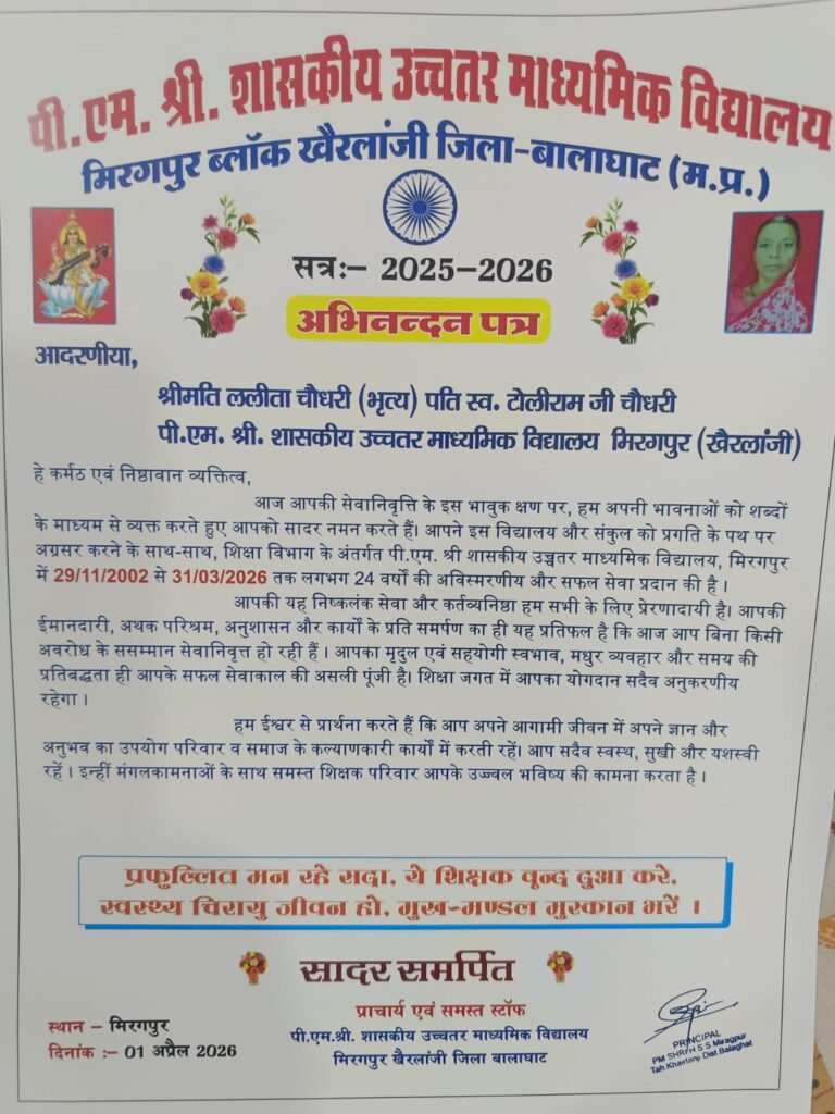 मिरगपुर/खैरलांजी (बालाघाट)। पीएम श्री शासकीय उच्चतर माध्यमिक विद्यालय मिरगपुर में कार्यरत भृत्य ललीता चौधरी के सेवानिवृत्ति अवसर पर एक गरिमामय एवं भावनात्मक विदाई समारोह का आयोजन किया गया। 31 मार्च 2026 को सेवानिवृत्त हुईं ललीता चौधरी ने लगभग 24 वर्षों तक शिक्षा विभाग में समर्पण, ईमानदारी और कर्तव्यनिष्ठा के साथ अपनी सेवाएं प्रदान कीं।